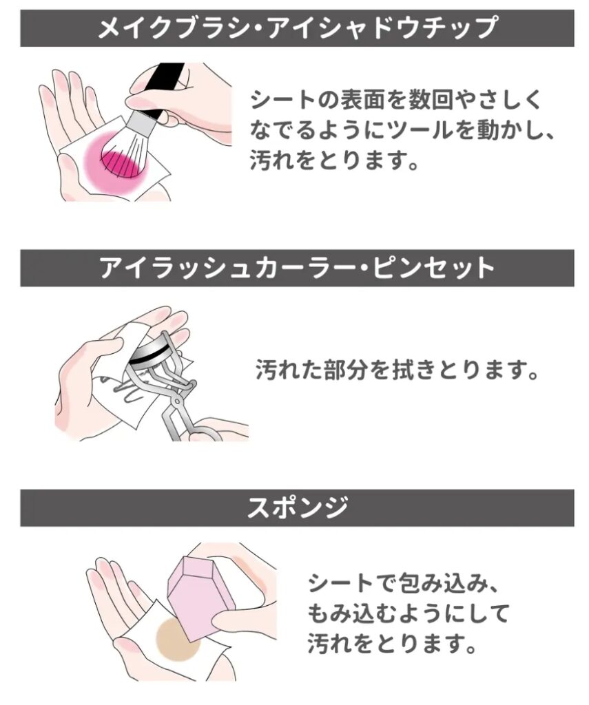 使用方法はとても簡単。汚れが気になるメイクツールをシートで拭き取るだけ。乾かす時間も不要で、すぐに使えます。